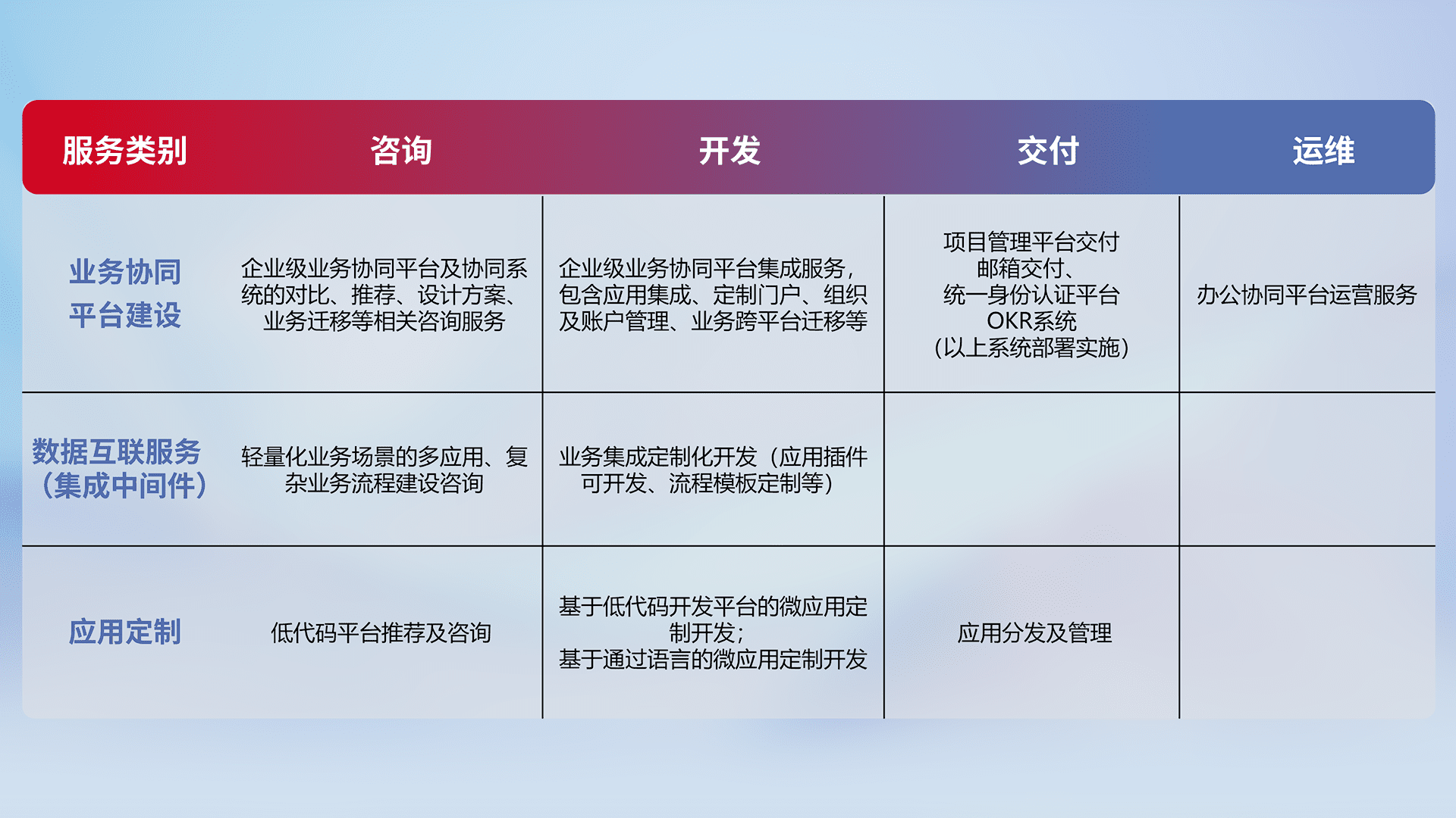 针对钉钉、、企微、、、IDaas等平台级产品提供产品的规划、、、方案、、交付、、定制化开发等服务,,,,实现如统一协同办公、、智能客户服务、、、混合会议管理、、智能数据查询、、、等业务场景,,,,实现数字化转型。。。。